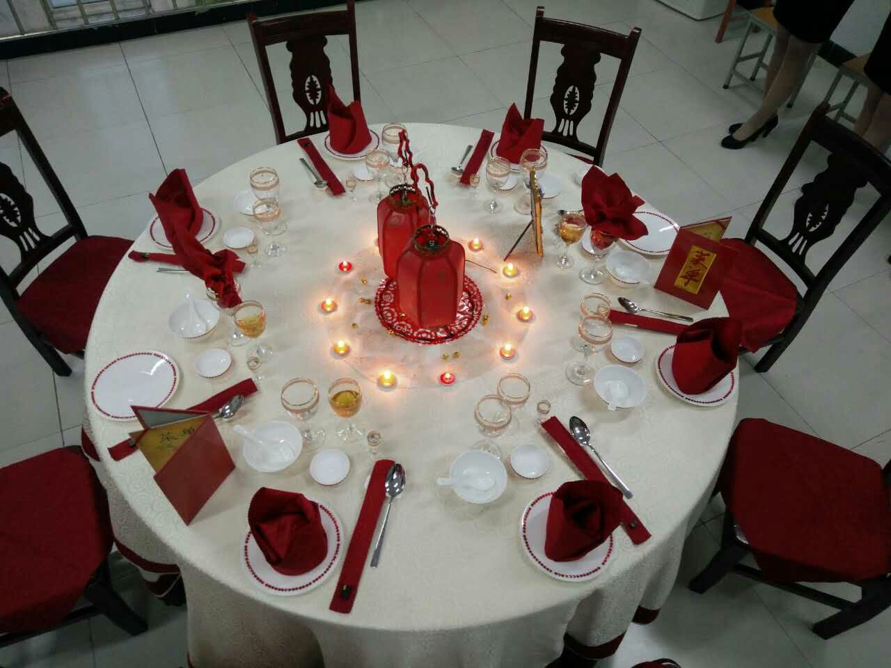接下來是緊張激烈的比賽,中式擺臺選手從容鎮(zhèn)定,又保證了比賽按時完成,福星高照主題使觀眾眼前一亮,中間大紅燈籠配上周圍飛揚的燭光,點亮了大賽的激情,仿佛預(yù)示著我們經(jīng)管系和我們周口科技職業(yè)學(xué)院未來一定福星高照,走上新臺階。悅耳的古箏琵琶配樂使現(xiàn)場觀眾和評委融入比賽主題中。