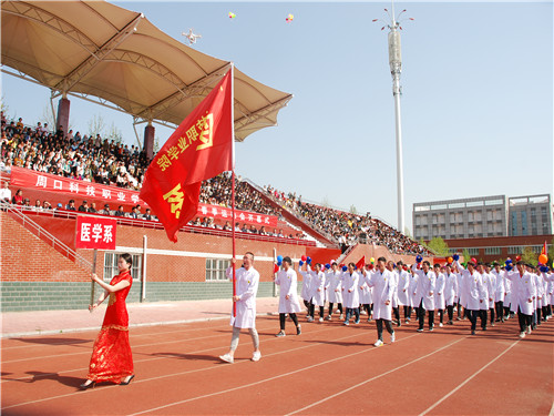 頓時(shí),音樂響起,各參賽代表隊(duì)進(jìn)行了入場儀式。首先,國旗護(hù)衛(wèi)隊(duì)手擎五星紅旗、抬著學(xué)院?;者~著矯健的步伐通過主席臺(tái)。接著,鮮花隊(duì)等各系代表方陣以及裁判員方陣入場。隊(duì)員們神采飛揚(yáng),英姿颯爽,他們敲響時(shí)代的強(qiáng)音,展示出當(dāng)代大學(xué)生的風(fēng)采,體現(xiàn)了周科師生團(tuán)結(jié)進(jìn)取、頑強(qiáng)拼搏的精神風(fēng)貌。