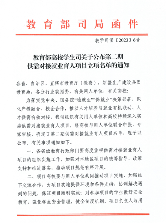 據(jù)悉,教育部供需對接就業(yè)育人項(xiàng)目于2021年啟動實(shí)施,旨在深化產(chǎn)教融合、校企合作,推動人才培養(yǎng)與就業(yè)有機(jī)聯(lián)動、人才供需有效對接。通過開展定向人才培養(yǎng)、建立就業(yè)實(shí)習(xí)基地、實(shí)施人力資源提升和加強(qiáng)重點(diǎn)領(lǐng)域校企合作,廣泛搭建校企合作平臺,大力拓展學(xué)生就業(yè)渠道,實(shí)現(xiàn)校企互利共贏、共同發(fā)展。