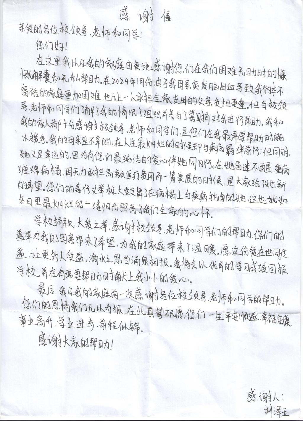 2024年3月5日,9001cc金沙2022級(jí)劉澤玉同學(xué)為感謝全校領(lǐng)導(dǎo)、老師和同學(xué)的幫助送來(lái)了一封感謝信。感謝我校師生在她的母親遭受疾病、全家手足無(wú)措的時(shí)候伸出援手,雪中送炭,為她的家庭帶來(lái)了溫暖,她希望這份愛(ài)意能繼續(xù)傳遞。同時(shí)以這樣的形式來(lái)表達(dá)自己的感激之情。