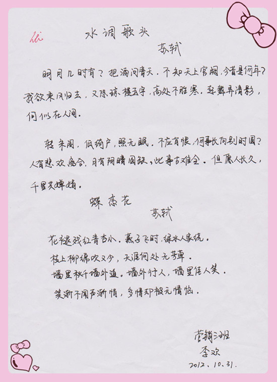 2012年10月31日,由經管系團委舉辦,經管系全體學生參與的第三屆硬筆書法大賽圓滿成功。在眾多參賽的作品當中,其中兩幅作品在該次大賽中脫穎而出,被各位評委老師評為優(yōu)秀作品。在此次活動中,不僅展示了我系學生多姿多彩的一面,就如他們的作品一樣,筆尖的剛勁,詮釋了他們對生活的領悟和執(zhí)著;而且從他們的作品字里行間中散發(fā)出一種青春的詩意。